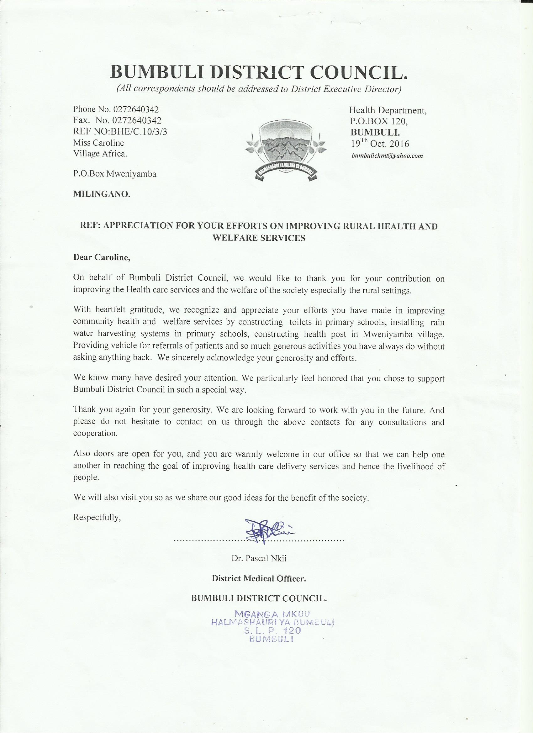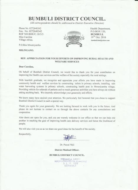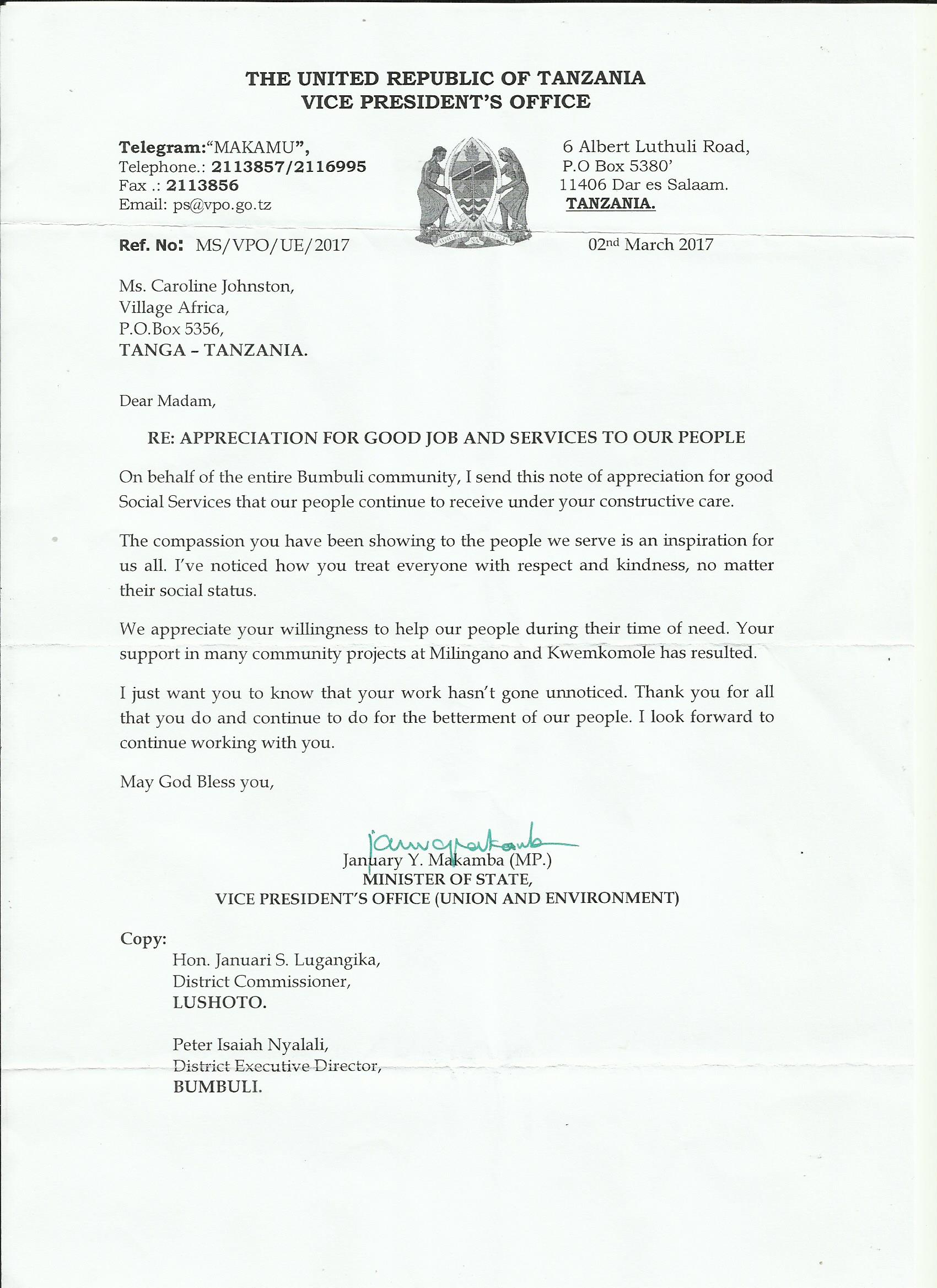 Letters of thanks from the Tanzanian Government